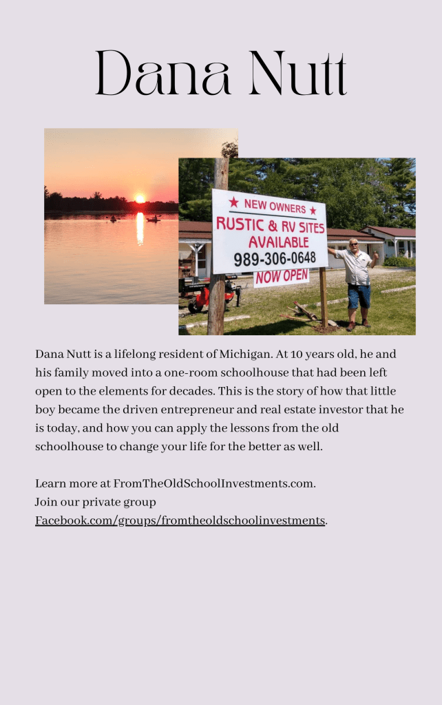 Dana Nutt is a real estate investor based in northern Michigan. Over the years, he has built a portfolio of single-family rental properties, residential neighborhood developments, spec houses, and a lakeside hotel. He recently published his book, Lessons from the Old Schoolhouse, in which he combines his memories of growing up in a one-room schoolhouse in Michigan with lessons on successful real estate investing. Order the book here or reach Dana at lessonsfromtheoldschoolhouse@gmail.com.